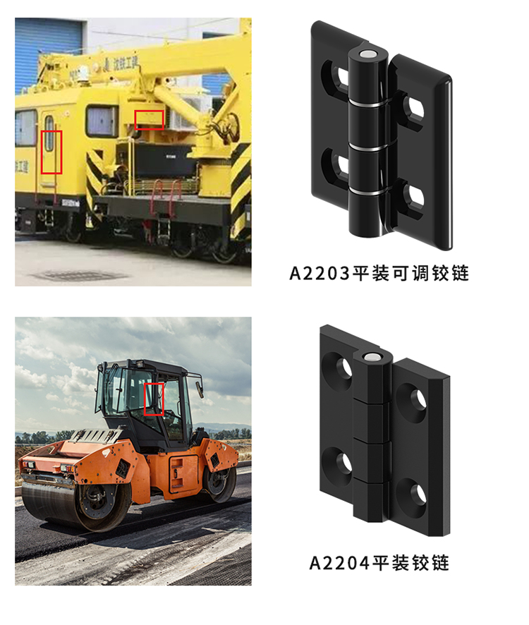 B2203/B2204鉸鏈采用高強(qiáng)度材料,耐久且承載力強(qiáng),重載高頻使用依然穩(wěn)定。設(shè)計(jì)精細(xì),運(yùn)動(dòng)流暢,減少摩擦磨損,延長使用壽命。防銹防腐蝕,適應(yīng)惡劣環(huán)境。可靠的固定性能,防止晃動(dòng)脫落,保障作業(yè)安全。可應(yīng)用于工程起重機(jī),鏟土運(yùn)輸機(jī)、混凝土攪拌車等駕駛室艙門安裝使用。