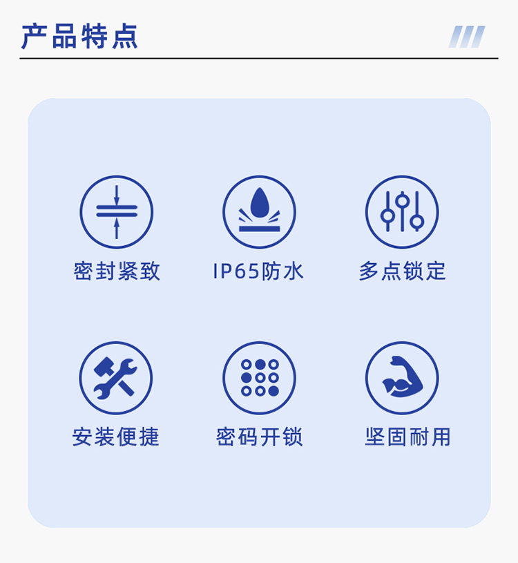 由于戶外機柜需承受各種?然災害的挑戰,保證設備正常?作,其在制作?藝上更為考究,尤其戶外一體機柜要匹配上一款合適的鎖具,對鎖具的性能和質量都有較高的要求。需要在鎖具具備高安全性的前提下,實現防水防腐蝕等功能。