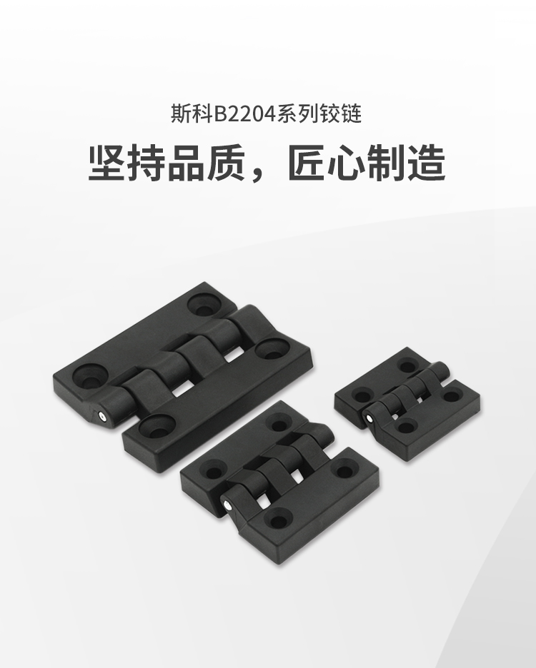B2204系列塑料鉸鏈采用優(yōu)質(zhì)塑料材質(zhì)具有良好的綜合性能,包括力學(xué)性能、耐熱性、耐磨損性、耐化學(xué)藥品性和自潤(rùn)滑性,且摩擦系數(shù)低,有一定的阻燃性,多種規(guī)格可選,盡可能的滿足您不同場(chǎng)合不同設(shè)備的安裝需求。