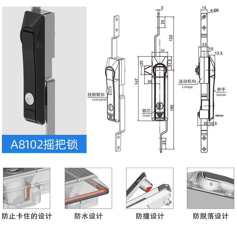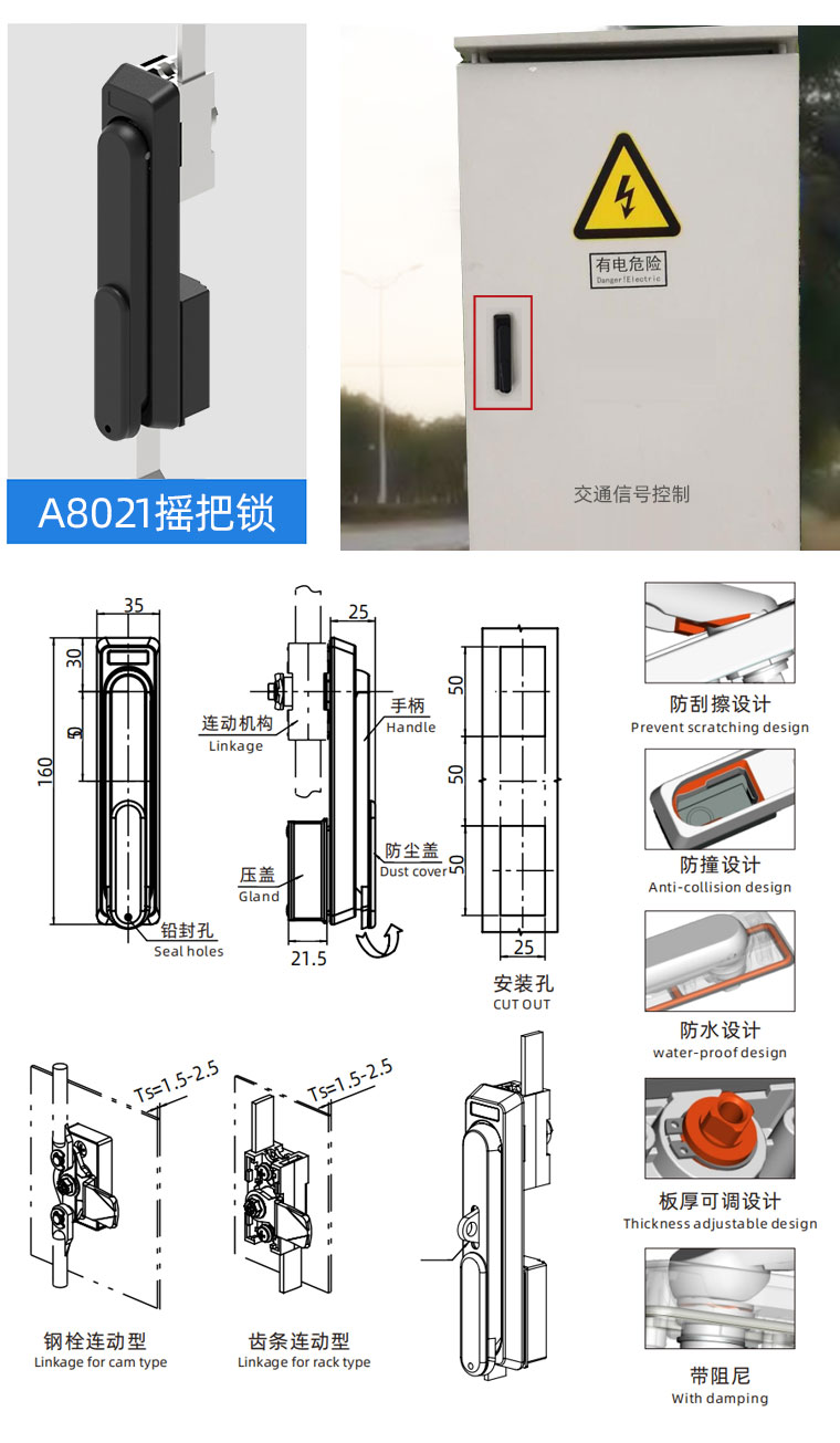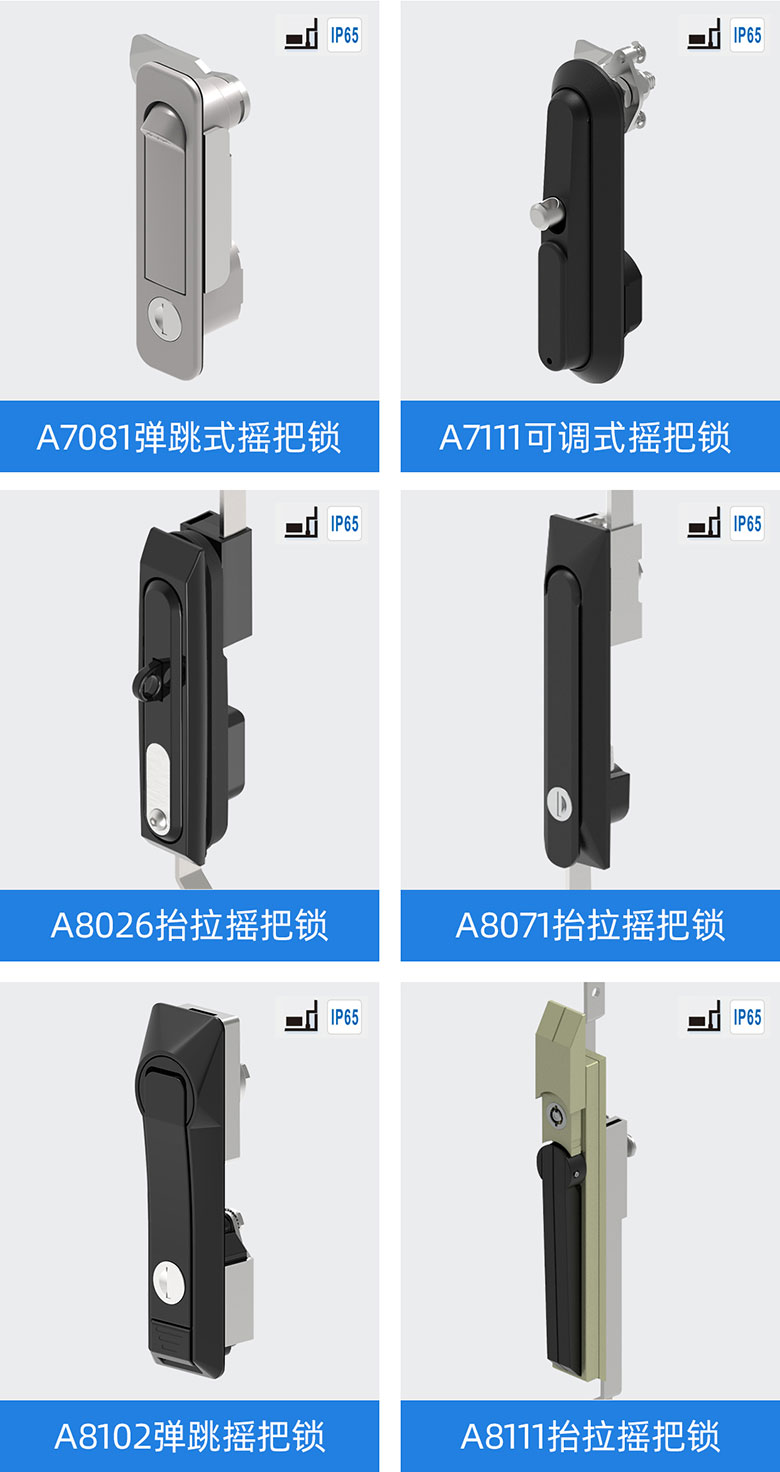 斯科搖把鎖系列產(chǎn)品在交通信號機(jī)柜應(yīng)用中發(fā)揮著重要作用。以下推薦的幾款搖把鎖鎖型全部達(dá)到IP65防護(hù)等級。鋅合金材質(zhì)以及特殊的表面處理提高了鎖體的硬度和耐腐蝕程度。適合交通信號機(jī)柜長期戶外使用。