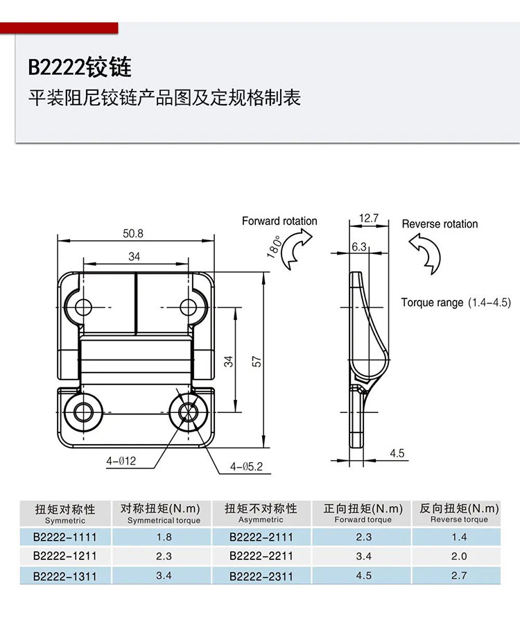 斯科B2222平裝阻尼鉸鏈采用埋入式安裝設計,占用極小的應用空間,操作穩定可靠,靜音順滑,恒定扭矩功能可固定在任意角度。鋅合金材質,防腐防銹抗壓,堅固耐用,無需維護,安全性更高,其受控運動可防止夾手,有很好的緩沖效果。