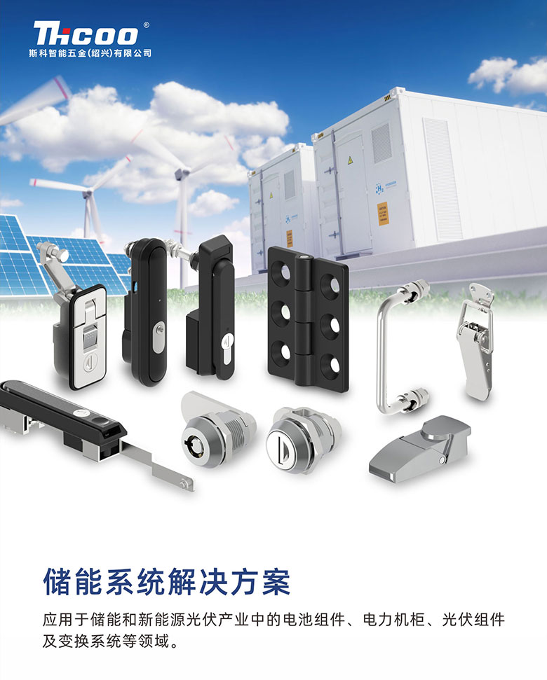 斯科是一家專業從事儲能和新能源光伏產業五金配套的企業。公司主要生產五金配套的鎖具、拉手、合頁、搭扣、密封膠條等系列產品,這些產品廣泛應用于儲能和新能源光伏產業中的電池組件、電力電纜、電力傳輸及變換系統等領域。