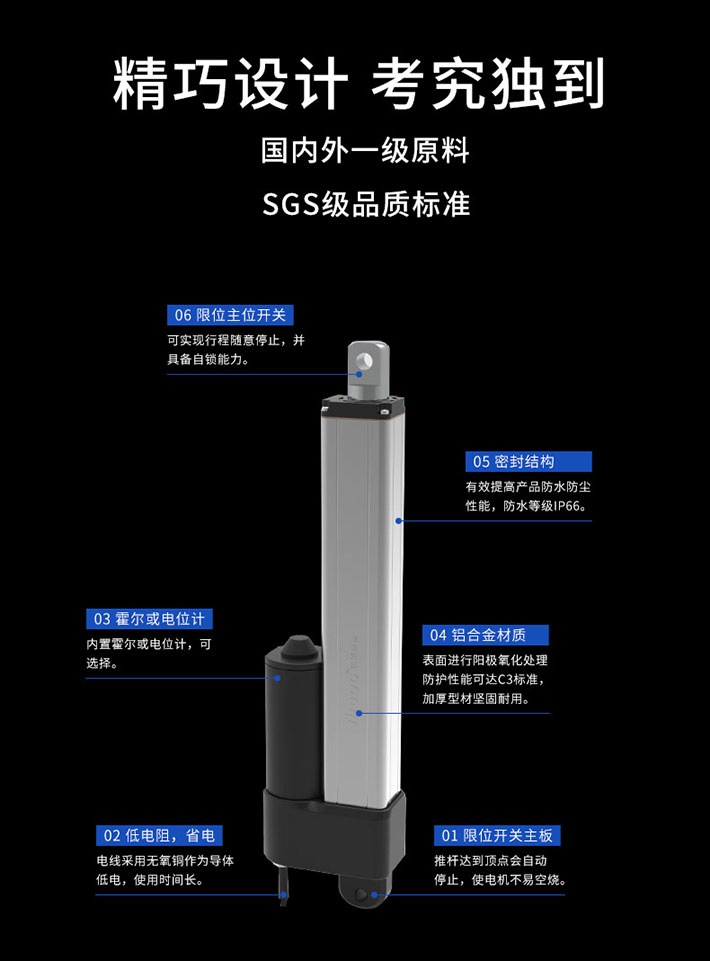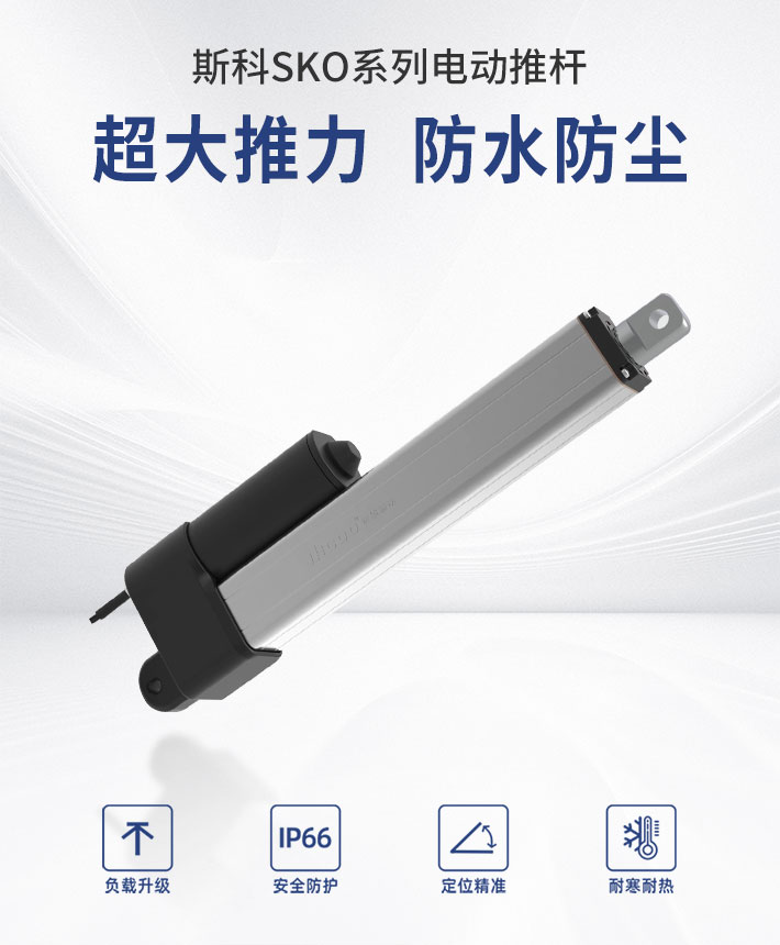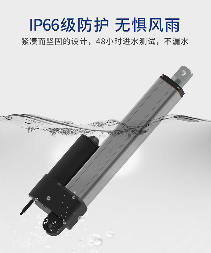 在應(yīng)用場景中,由于各種復(fù)雜的環(huán)境,電動推桿防水防塵技術(shù)是至關(guān)重要的,斯科推桿擁有IP66高防護等級(防水防塵),傳統(tǒng)電動推桿的全方面改進款,四角造型,精密貼合,電機內(nèi)置螺絲更防水,氣動件封閉原理,48小時進水循環(huán)伸縮實驗測試,不漏水。