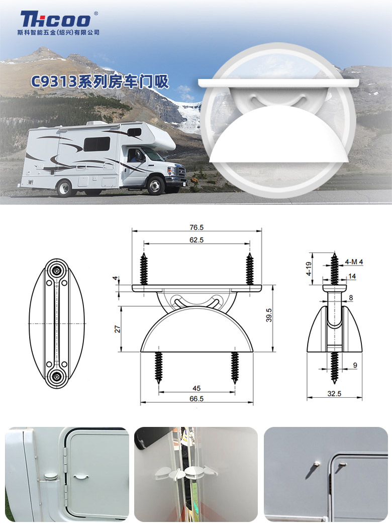 此外,斯科新品房車門吸C9313系列采用優質尼龍材料,防震靜音吸合力強,質量可靠,經久耐用。其安裝簡單便捷,無需復雜操作,即可輕松完成。這款門吸能有效確保房車艙門的穩定性和安全性,防止門意外關閉或受到損壞。