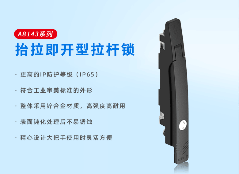 而全新推出的A8143系列抬拉即開拉桿鎖則集美觀、可靠和安全于一身。它采用高品質鋅合金材料,經過精密加工和表面處理,具有防水、防腐、防撞、防止卡住等出色性能。產品外觀設計簡潔大方,光滑平整,線條流暢,手感舒適,充分展現了工業級可直觀感受的品質。