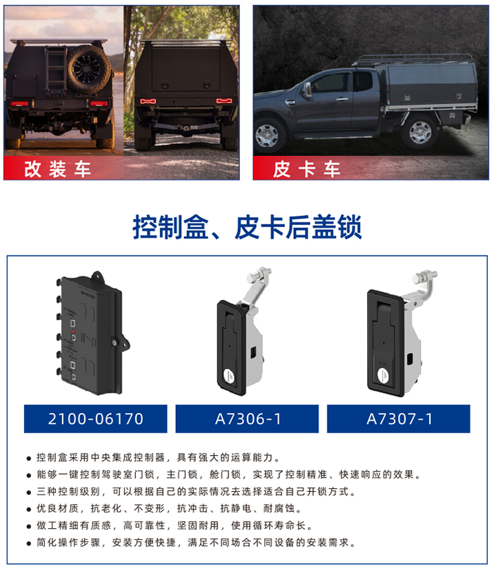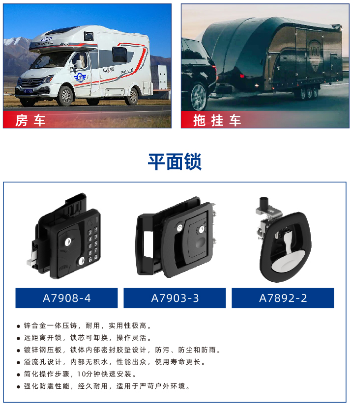 本次展會,斯科將展出包括房車門鎖、柜門鎖、皮卡后蓋鎖、房車鉸鏈、搭扣以及其他房車配件等在內(nèi)的多款房車五金產(chǎn)品。其中,斯科的新款房車電子門鎖,憑借其出色的安全性能和穩(wěn)定性,受到了業(yè)內(nèi)專家和消費者的一致好評。此外,斯科還將展出多款適用于不同房車類型的門鎖控制盒,滿足不同消費者的個性化需求。