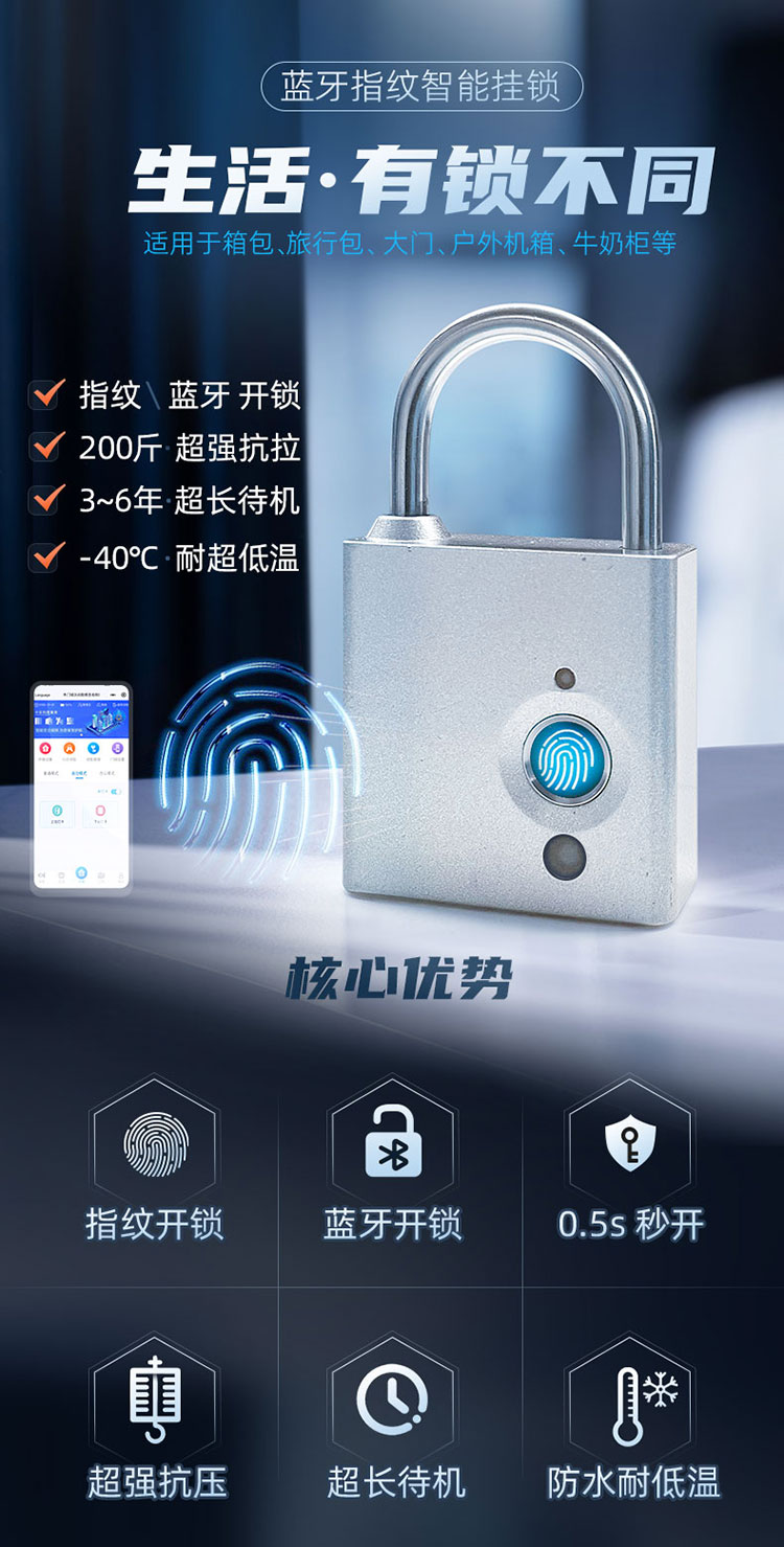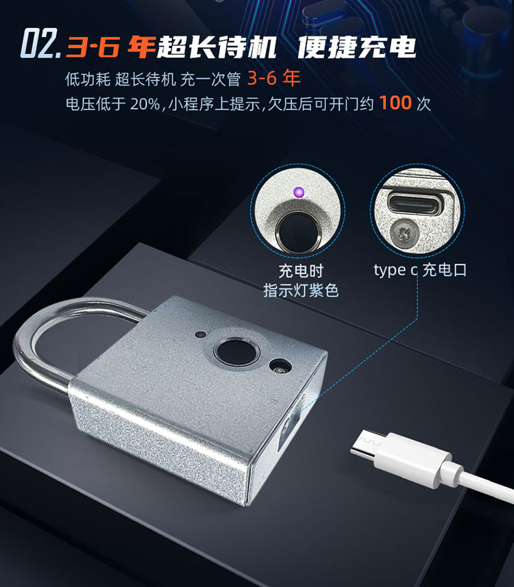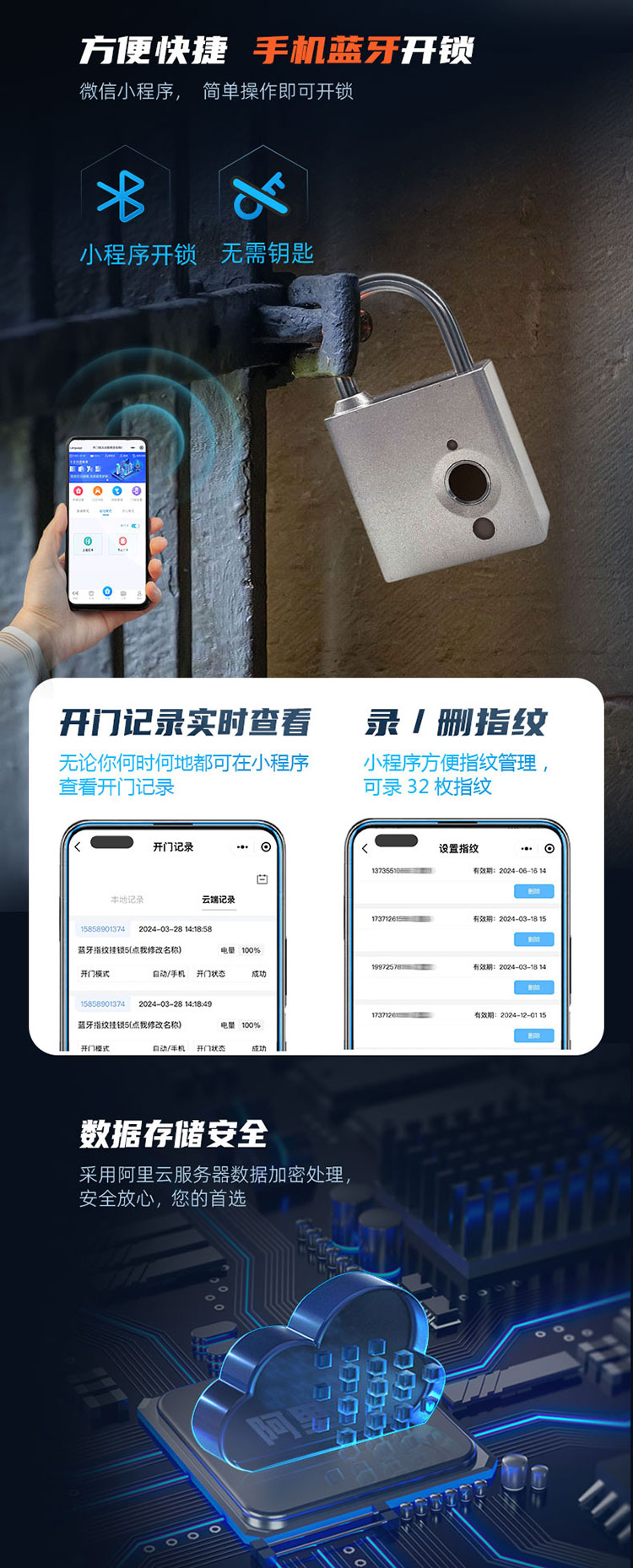 除指紋開鎖快捷方便之外,可以連接藍牙,進入微信小程序開鎖。不但解決了隨身攜帶鑰匙的苦惱,還解決了時間和空間的開鎖不便。讓您的生活實現了隨時開鎖自由!管理員可實時查看開鎖記錄,刪除已授權指紋,以防人事變更。在安全性設計,斯科智能掛鎖可謂是層層防護。