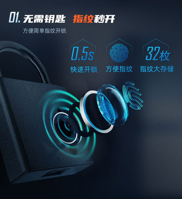 斯科A6601智能電子掛鎖的指紋模塊采用的是先進的半導體指紋芯片,感應高度靈敏,0.5秒快速開鎖。一把傳統的掛鎖最多5把鑰匙,而斯科智能掛鎖可以錄入32組指紋,相當于有32把鑰匙,只要能用得上的人都可以錄入進去,也不用隨身攜帶鑰匙,想開鎖用下指紋就可以了。