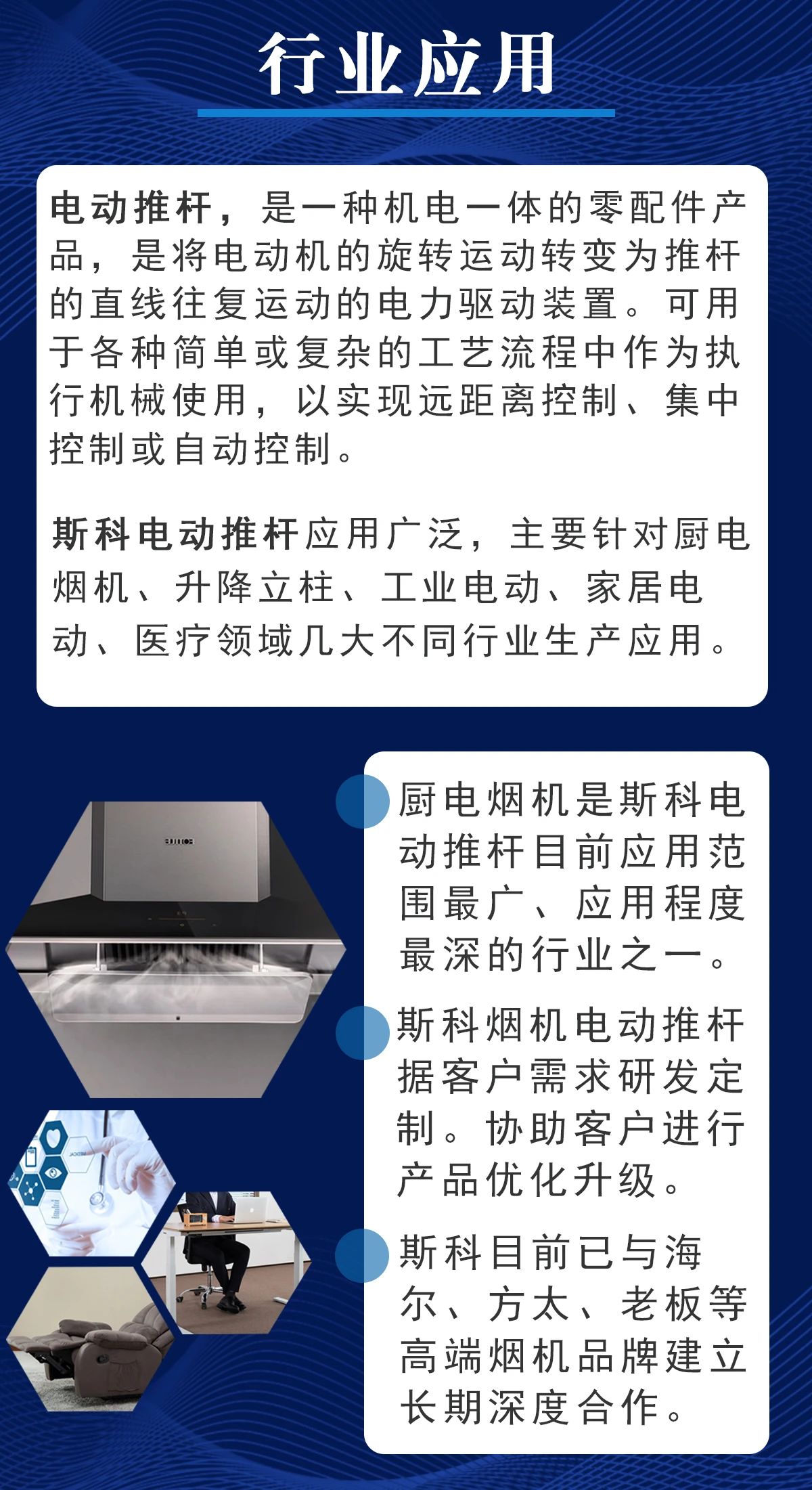 斯科電動推桿應用于廚電煙機、升降立柱、工業(yè)電動、家居電動、醫(yī)療領域幾大行業(yè)。